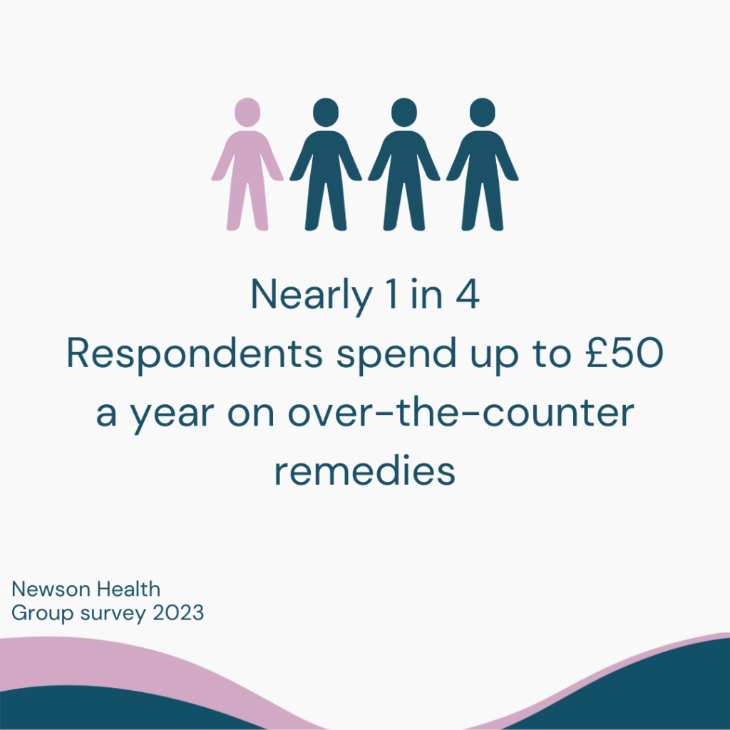 Similarly, over half of respondents (55%) had increased the amount of prescription painkillers and over-the-counter medication they take to try to manage their menopause-related symptoms. Nearly a quarter (22%) said they spend up to £50 a year on OTC remedies, while one in eight (15%) were spending in excess of £100 a year on pain relief, eye drops and herbal remedies.